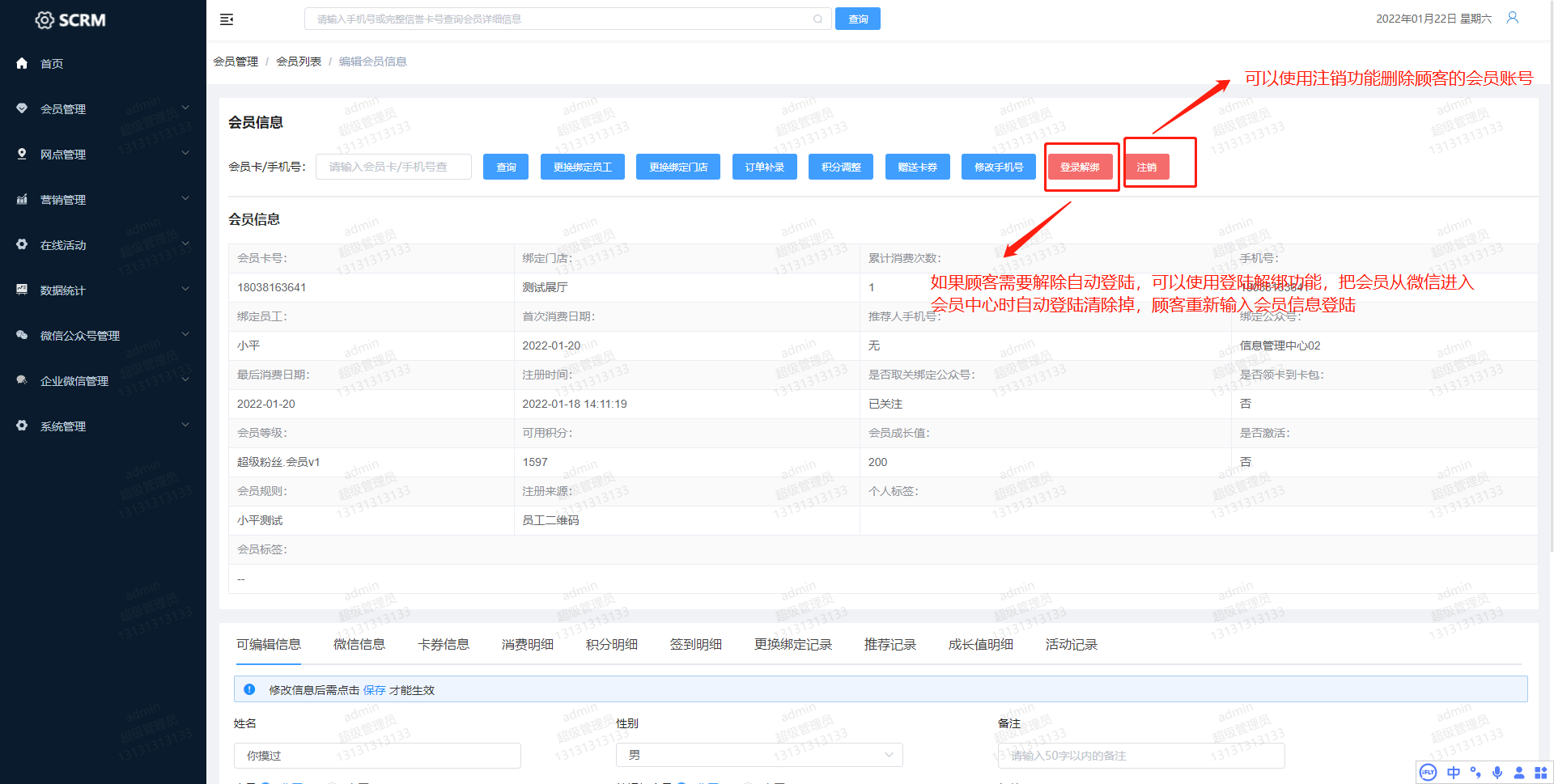 web 端-会员管理,增加注销会员账号功能,增加登陆解绑功能,优化会员改绑员工操作,增加填写会员备注以及导出会员数据时带有备注;